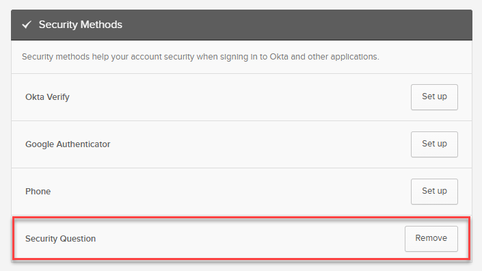Note: A valid Security Question is required to reset your password. Never remove your Security Question security method without setting up a new Security Question.