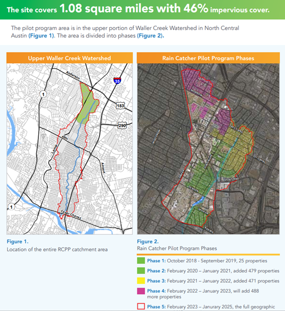 The City of Austin’s Rain Catcher Pilot Program is a collaboration between Watershed Protection, Austin Water, and Development Services. The program installed 117 cisterns ranging from 500 gallons up to 6082 gallons on 40 different properties. This created a network of many small-scale features distributed across multiple locations on diverse properties rather than one centralized stormwater system. Not only did this give the project a participant-centered focus but also helped reduce runoff across the area by capturing much of the stormwater and allowing it to soak into the ground.