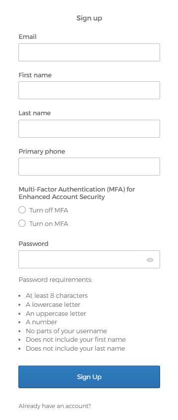 Enter your Email, First and Last name, Primary phone, and Password. Use the Multi-Factor Authentication (MFA) for Enhanced Account Security checkbox to opt into MFA (Turn on MFA) or opt out of MFA (Turn off MFA). If you are unsure, select Turn off MFA. You can update this setting later.