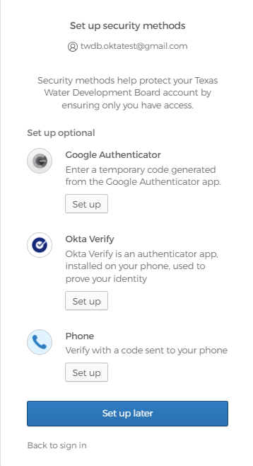 You will be prompted to set up additional authentication options to secure your Okta account. You can set up your Okta account with multifactor authentication or click Set up later.