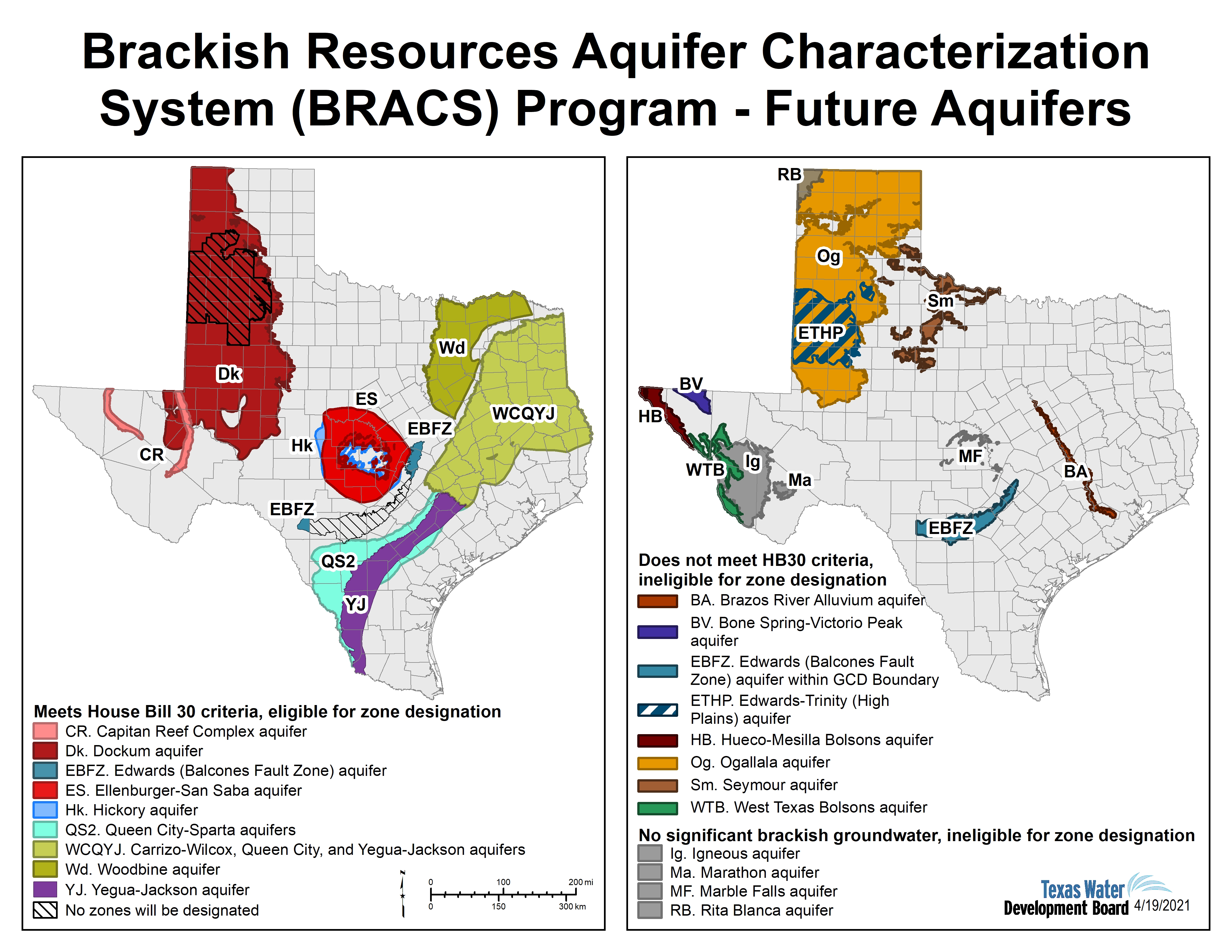 In 2009, the 81st Texas Legislature, approved funding to implement the Brackish Resources Aquifers Characterization System (BRACS) program to more thoroughly characterize the brackish aquifers. In 2015, the 84th Texas Legislature passed House Bill 30, (codified as Texas Water Code Section 16.060), directing the TWDB to identify and designate brackish groundwater production zones in the state. The 86th Texas Legislature also passed Senate Bill 1041 that extended the deadline to complete zone designations from December 1, 2022, to December 1, 2032, and House Bill 722, (codified as Texas Water Code Section 36.1015), that established a permitting framework for developing water supplies from TWDB-designated brackish groundwater productions zones. To learn more about status of zone designation visit our webpage.
